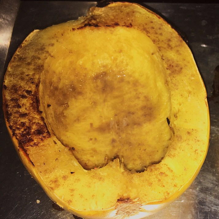 - Bake the squash in the oven for 45 minutes at 350 degrees or until the squash is tender. I bake the squash face down and put a bit of water on the pan that I bake it on. In the last 15 minutes of cooking, I’ll flip the squash over so that it can get a nice golden brown color on it.